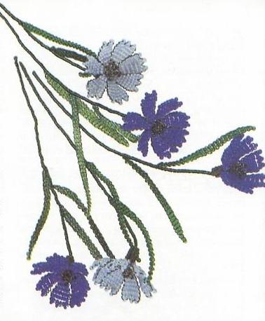 Как и всегда, я подобрала для вас не один мастер-класс плетения василька. Первый способ изготовления этого цветочка банален: сплетите обыкновенную чашечку для цветка, в зависимости от размера чашечки наберите на проволоку несколько сантиметров синего бисера, скрутите проволочку в 4 дуги, как показано на фото.