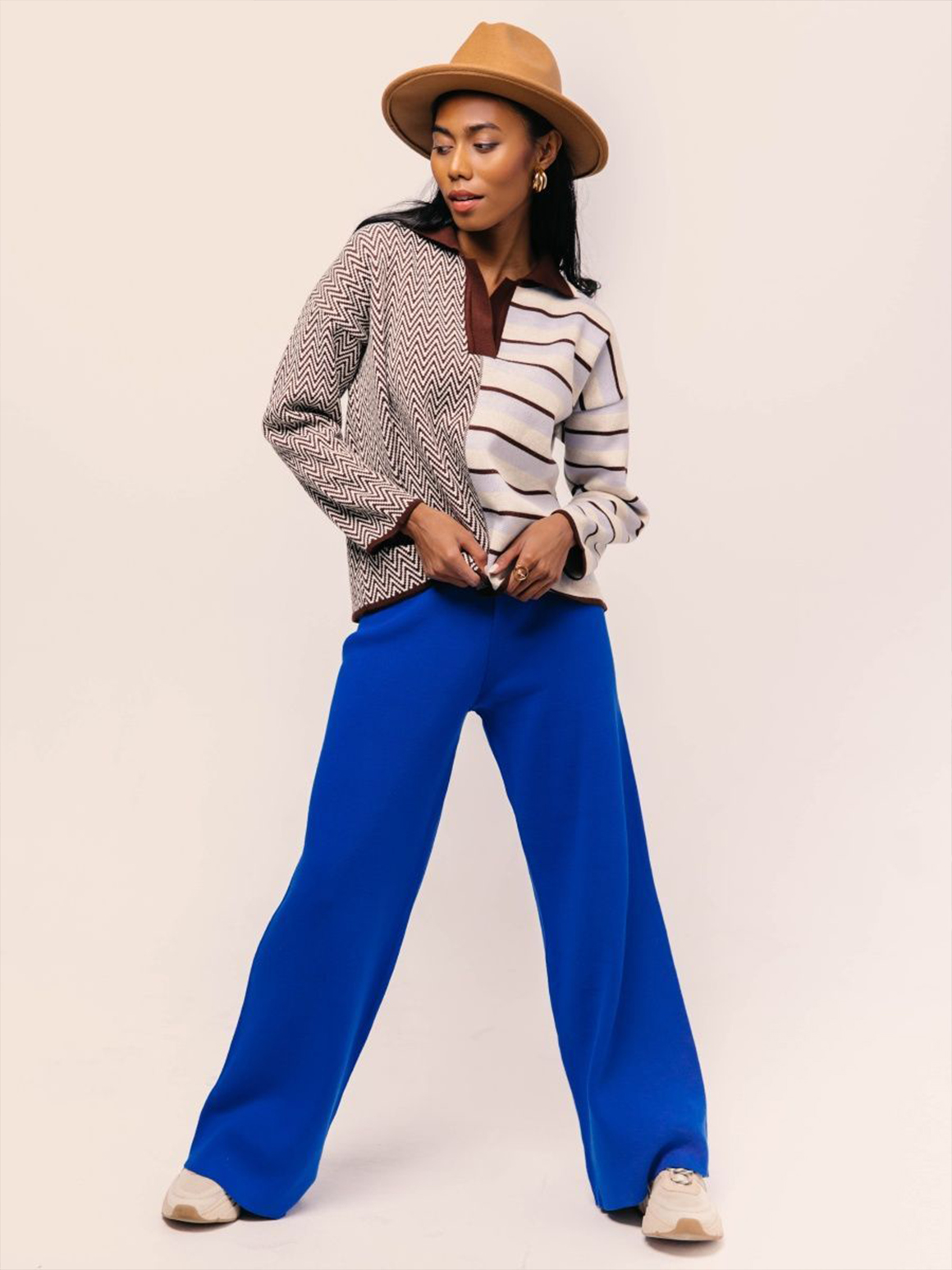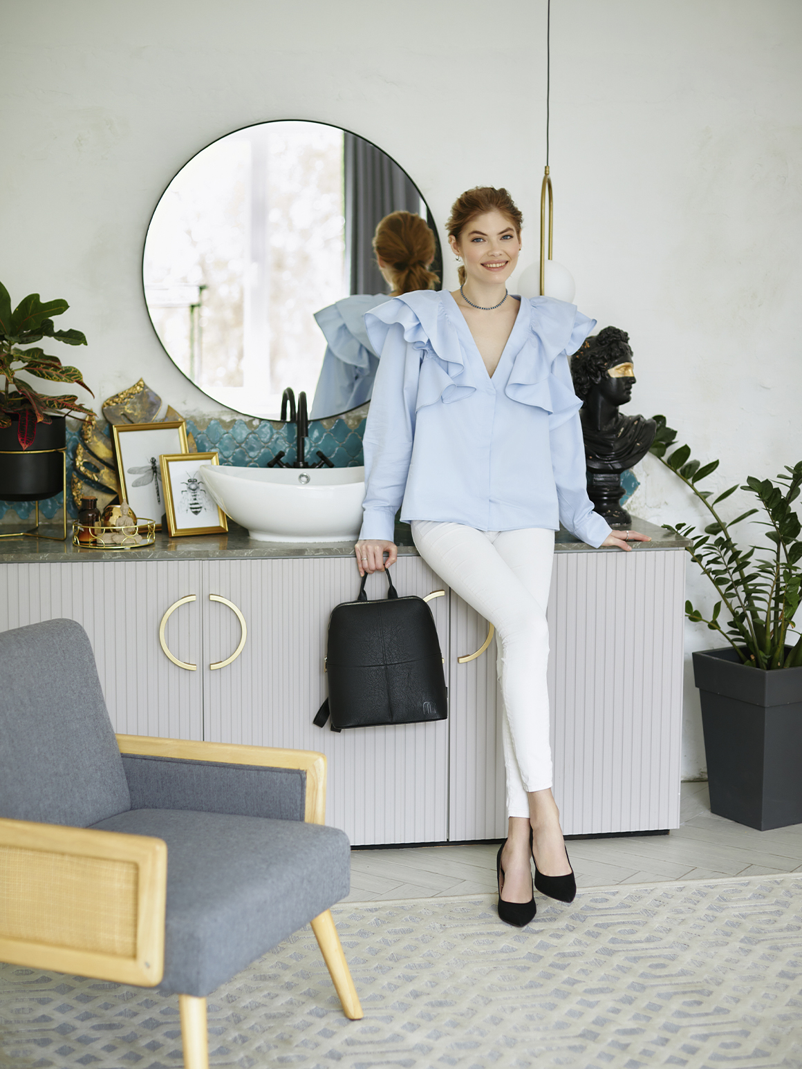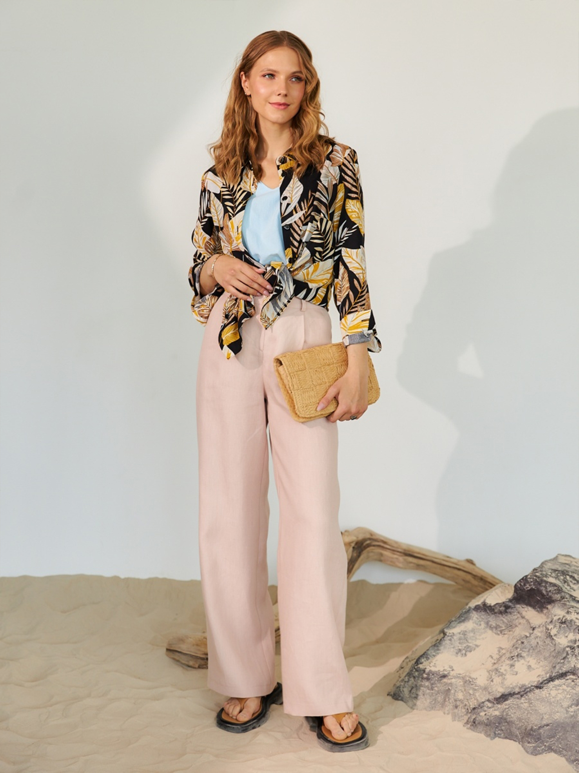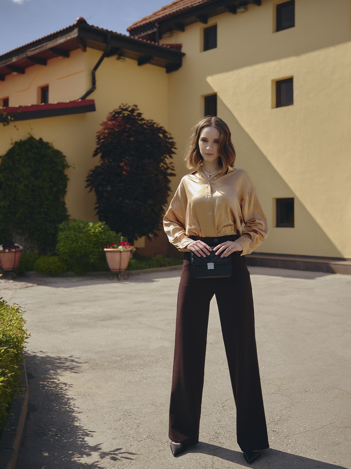 Женская одежда 80-х годов в моде уже не первый сезон. Создавать интересные сочетания можно из блуз с пышными рукавами, делающими плечи широкими. Возьмите блузку глубокого розового цвета и соедините ее с широкими брюками. Дополнить образ можно тоутом и туфлями-лодочками.