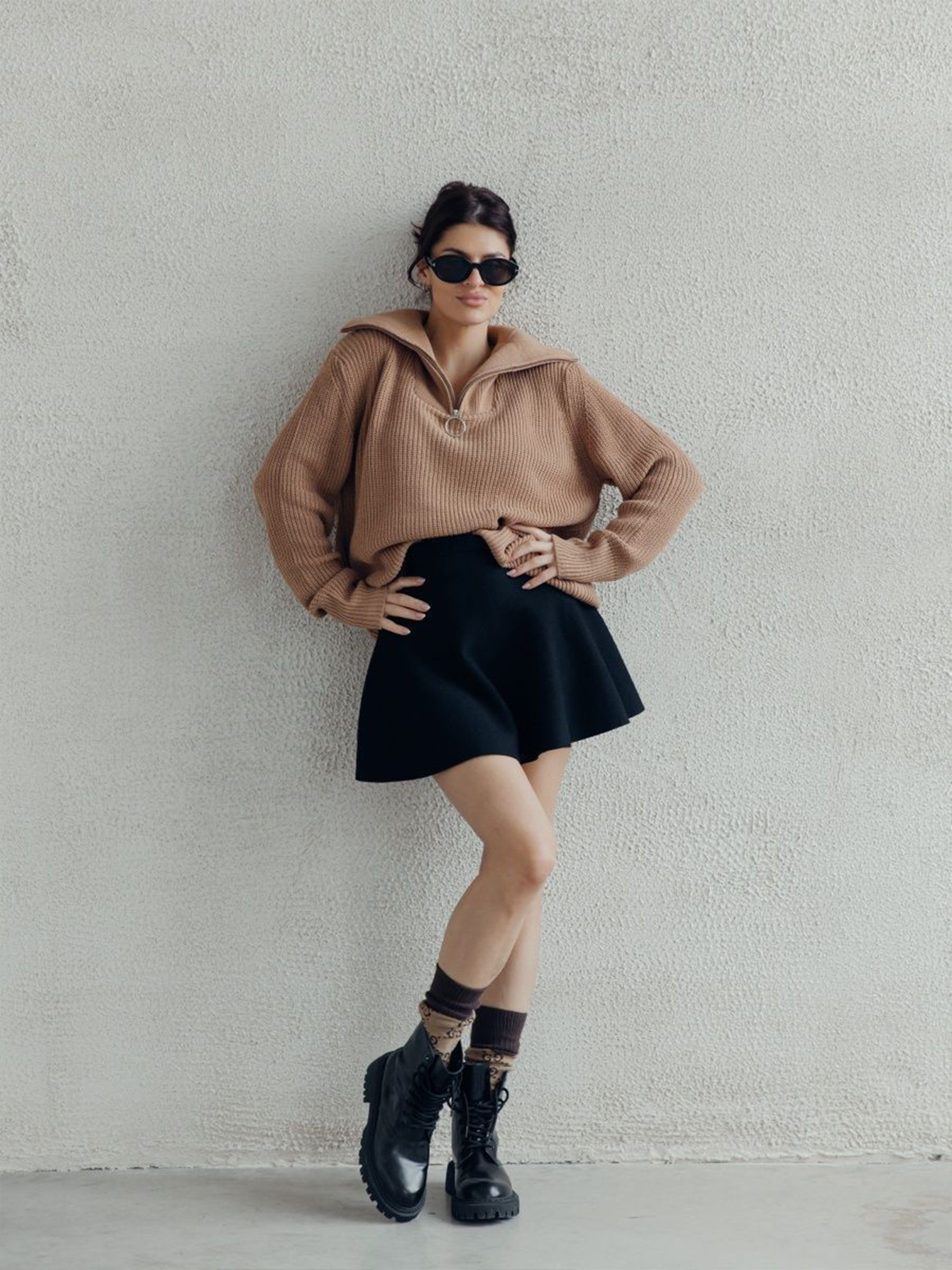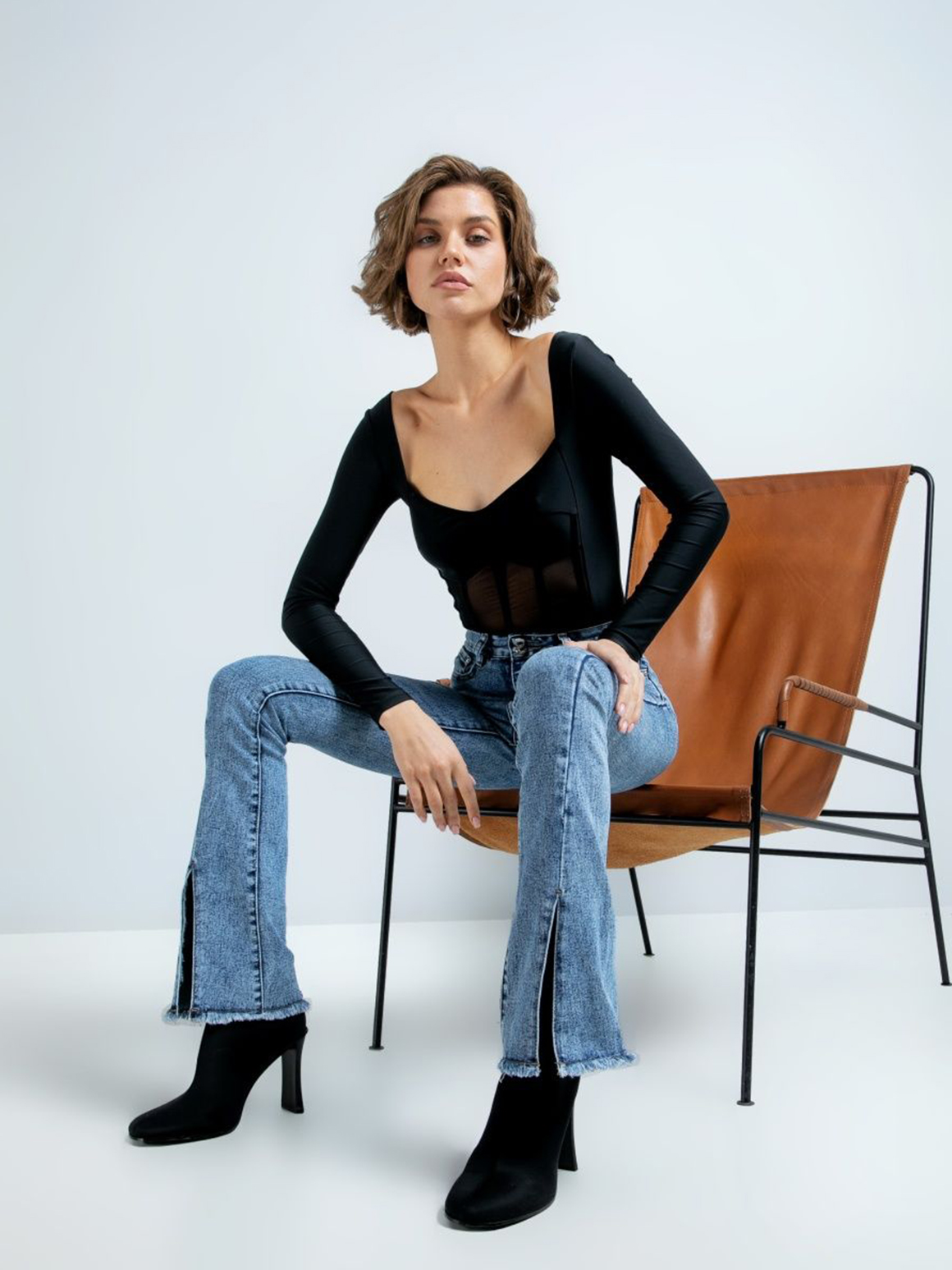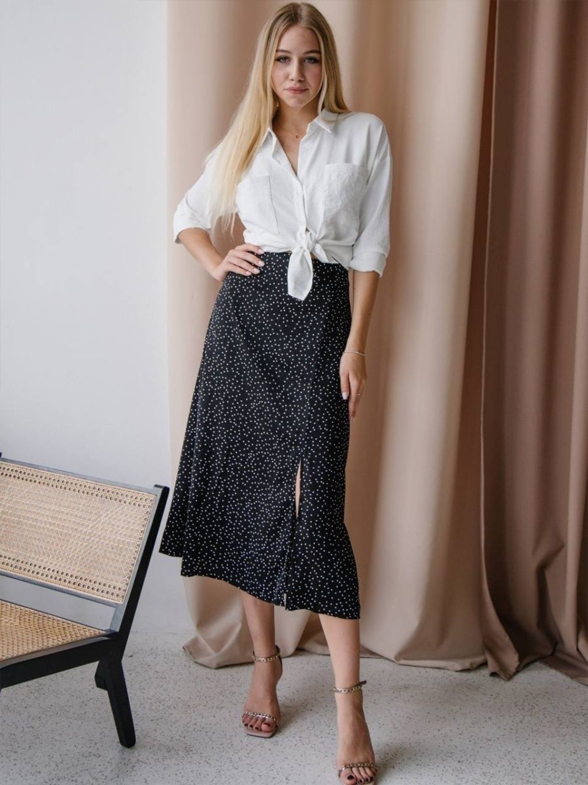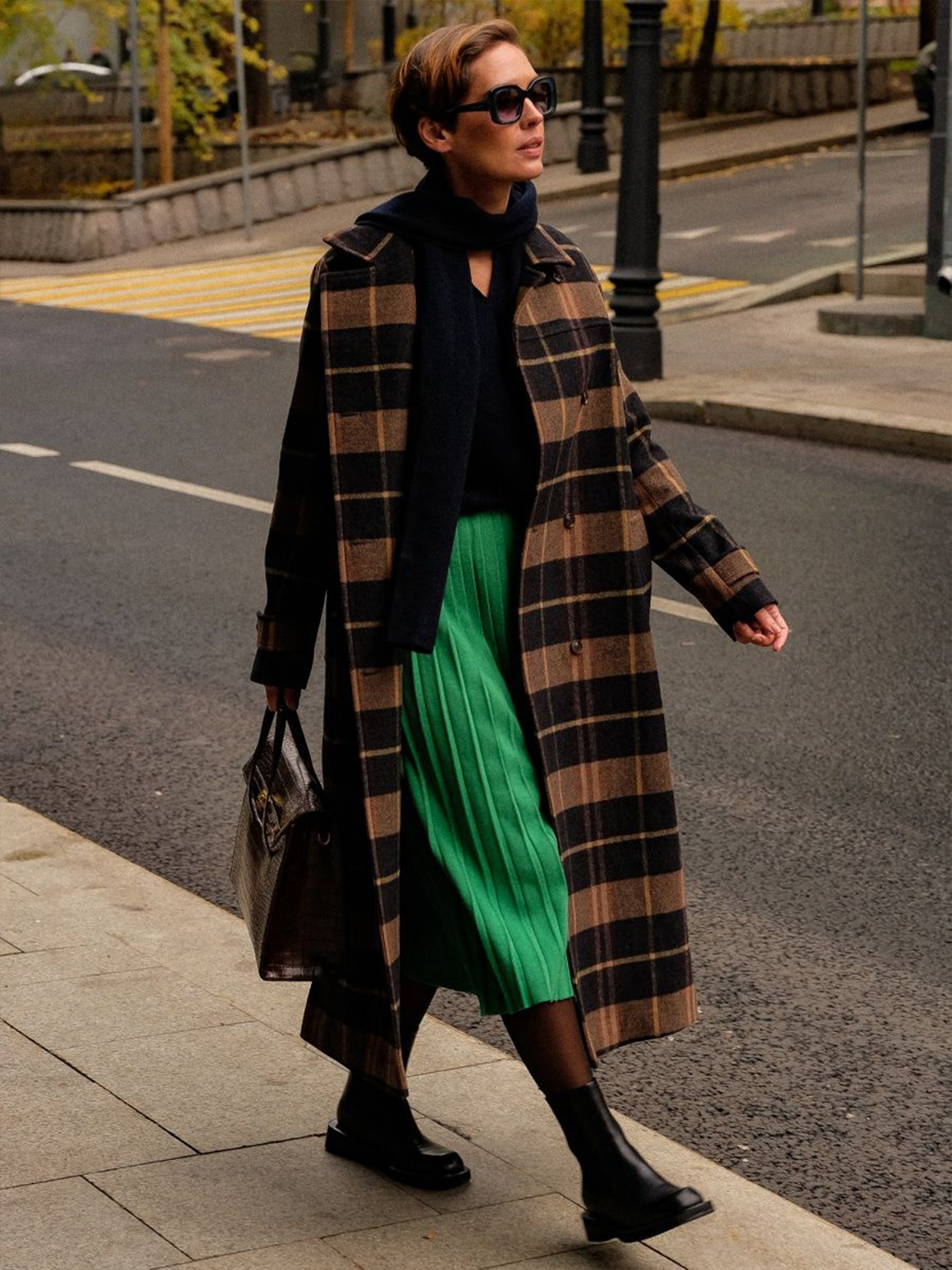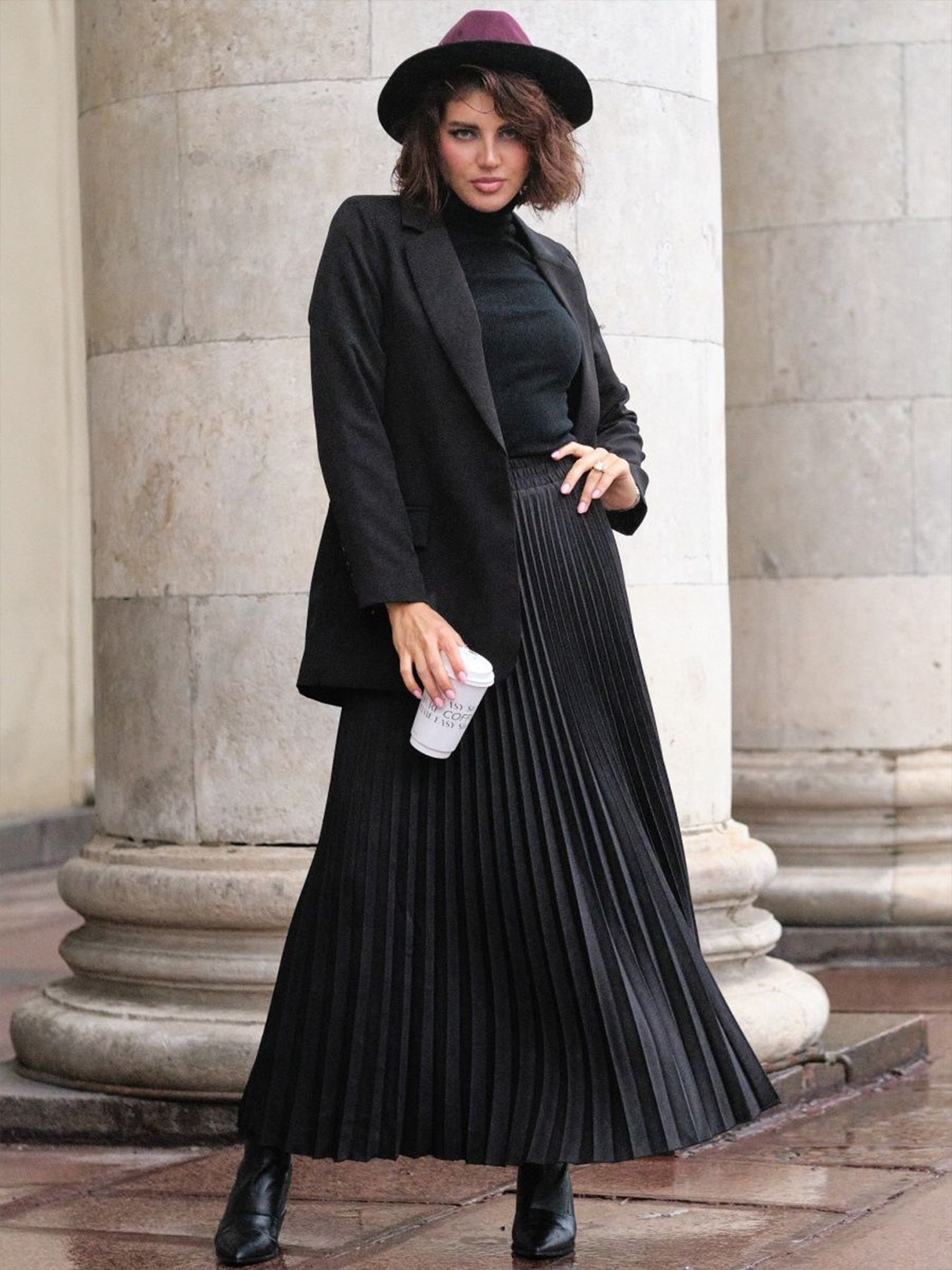 Хотите повторить элегантный образ бывшей жены Мика Джаггера Джерри Холл? Для этого вам потребуется облегающее черное мини-платье и черные колготки. Для теплой погоды подойдут туфли на тонком каблуке, а для холодной — высокие ботфорты. Завершит лук сумка-багет, как отсылка на другую эпоху.