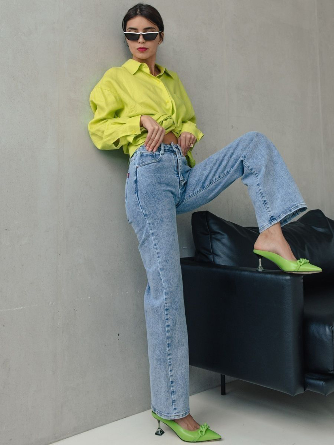Молодежь восьмидесятых обожала спортивные луки. Девушки любили одеваться ярко, подчеркивая достоинства своей фигуры. Отдайте дань моде тех годов и создайте лук в стиле спорт-шик, используя массивные кроссовки, джинсы силуэта mom с эффектом вареного денима, яркую футболку и модный бомбер в цвет. Для макияжа воспользуйтесь яркими тенями, которые в тренде в 2022. Завершите образ текстильным шоппером.